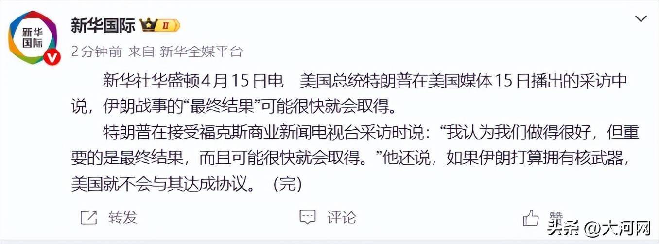 据新华社,美国总统特朗普在美国媒体15日播出的采访中说,伊朗战事的“最终结果”可能很快就会取得。