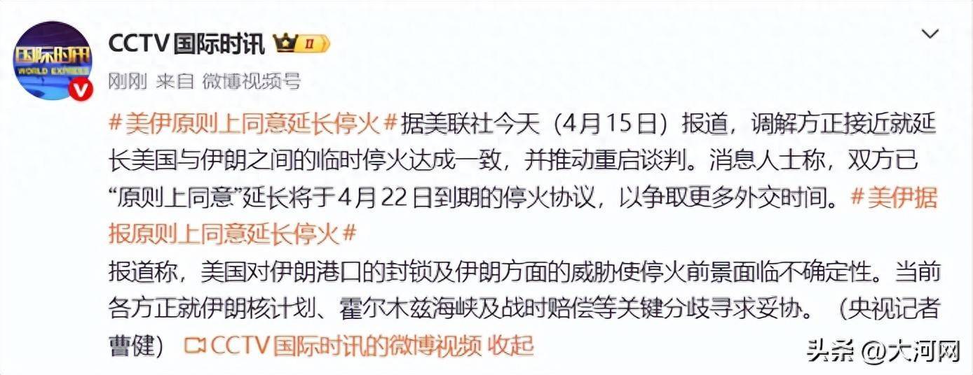 据@CCTV国际时讯,据美联社今天(4月15日)报道,调解方正接近就延长美国与伊朗之间的临时停火达成一致,并推动重启谈判。消息人士称,双方已“原则上同意”延长将于4月22日到期的停火协议,以争取更多外交时间。